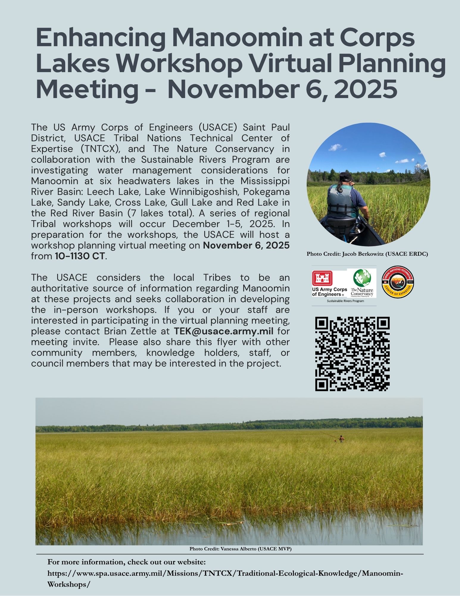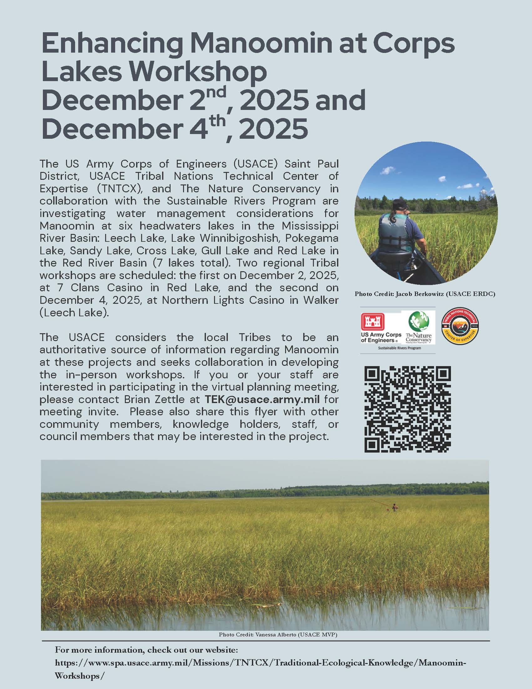 Manoomin (Ziznia sp.) is a sacred plant, food, and medicine for indigenous peoples throughout the Great Lakes region that is central to their cultural identity, traditions, and livelihood. It also provides critical environmental services, such as shoreline stabilization, nutrient sequestration, and valuable wildlife habitat. However, multiple factors including climate change, land use, pollution, and invasive species are contributing to a rapid decline in healthy Manoomin populations. USACE projects directly and/or indirectly contribute to the Manoomin threats and stressors, thus the USACE is uniquely positioned through the management and operation of their project lands to have potential for Manoomin enhancement. Native people have stewarded Manoomin for generations and have a keen understanding of the connection between healthy Manoomin, people, and ecosystems but tribal views, concerns, and treaty rights are often not adequately considered into decisions that impact Manoomin. Numerous federally recognized Tribes in the MVP area of responsibility have expressed interest in collaborating with MVP regarding Manoomin.